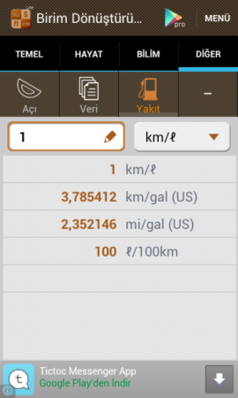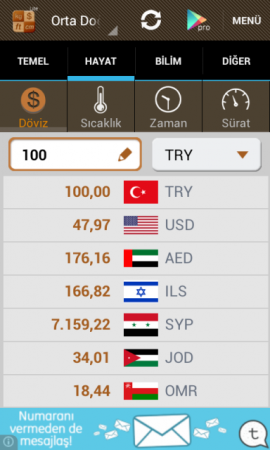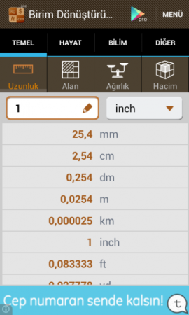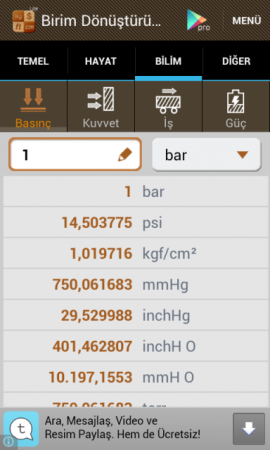 ![]() Birim Dönüştürücü Android Benim de telefonumda yüklü olan harika bir Android Birim Dönüştütücüdür! Genelde bu tarz Android uygulamalar yapan Smart Tools® koleksiyonundaki genişletilmiş setinden sadece biri olan bu Birim Çevirici ile işiniz çok daha kolaylaşacaktır. Mobil cihazlarda birçok değişik türde bir sürü birim dönüştürücü bulabilirsiniz, lakin bu onlardan daha farklıdır. Çünkü kullanımı kolay, Türkçe olması nedeni ile anlaşılır, sade ve hoş arayüzü ile diğerlerinden farklılığını hisstirmekdir. Bu Birim Dönüştürücü apk ile ister okulda ödevleriniz için kullanın, isterseniz iş yerinde, evde, araba da, döviz bürosunda her yerde işinize yarabilecek tarzda bir Android uygulamasıdır. Günlük hayatta kullanılan temel birimleri içeren 15 kategorisi vardır. Desteklenen birimler listesi - Temel : uzunluk (mesafe), alan, ağırlık (kütle), hacim (kapasite) - Hayat : döviz kuru, sıcaklık, zaman, sürat(hız) - Bilim : basınç, kuvvet, iş (enerji), güç - Diğer : açı, veri, yakıt tüketimi Otomatik olarak ülkenize bağlı olarak özel birimleri destekler. Ayrıca, tablet PC için yatay modu destekler. |