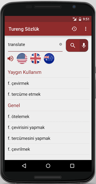 ![]() Tureng Sözlük Android Mobil Uygulaması Türkiye’nin en kaliteli online Türkçe-İngilizce sözlüğü olan Tureng Sözlük, artık Android kullanıcılarına da hizmet veriyor. Milyonlarca kişi tarafından kullanılan Tureng Sözlük şimdi de rahat kullanımı ile mobil Android cihazlarda. En doğru sonucu en hızlı şekilde verebilmeyi hedefleyen ve içeriğinde kullanım alanlarına göre kategorilendirilmiş üç milyondan fazla terim bulunduran "Tureng Sözlük Android" uygulaması bu alanda da yine fark yaratmışa benziyor. Aranan kelimeyi, en çok bilinen 3 farklı İngilizce aksanda seslendirme özelliği ile kullanıcılarının hizmetine sundu. Bulmadığınız sonuçlar için tercüme edilmesi ile geliştirilmekte olan veritabanı ile Tureng Sözlük ekibi tarafından hergün geliştirilmektedir. Türkçe’ye çevrilemeyecek ifade kalmayana kadar çalışmalarına devam edecek olan Tureng SözIük, on senelik çeviri geçmişine ve deneyimine sahip çevirmenler tarafından kurulmuş olan Tureng Çeviri firmasının, çeviri, eğitim, mühendislik, iş dünyası ve dış ticaret sektöründe çalışanlara sunduğu tamamen ücretsiz online sözlük hizmetidir. Tureng Sözlük Hakkında; 15 senelik çeviri geçmişine ve deneyimine sahip çevirmenler tarafından kurulmuş olan Tureng Çeviri firmasının sunduğu online sözlük hizmetidir. Sözlük, temel olarak çeviri sektöründe çalışan ve dış ticaret yazışmaları yapan kullanıcılar için oluşturulmuştur. Her kelimeye, terime, deyime, söz öbeklerine ve kullanım alanlarına göre bütün anlamlarına kolayca ve hızla ulaşılabilen bir kaynak olarak tasarlanmıştır. İnteraktif çalışma biçimi, kullanıcı aramalarıyla sürekli olarak güncellenen ve güçlendirilen veritabanı, kolay kullanıma sahip arayüzü, kullanıcı önerileri ve şikâyetlerini dikkate alarak yapılandırma, kullanım seçenekleri ile artık çevirilerinizi, yazışmalarınızı ve araştırmalarınızı yük olmaktan çıkarabilirsiniz. |